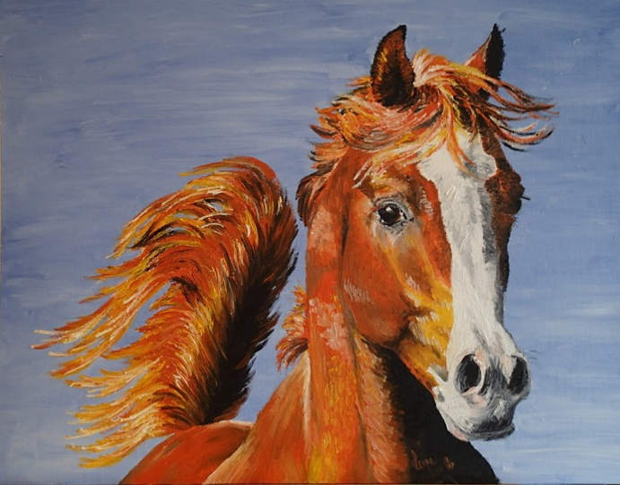Bilde med orange bakgrunn, dressurhest: ca 38 x 46 cm