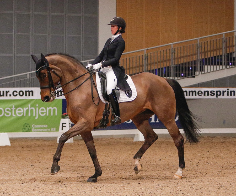 På tredjeplass fulgte regjerende norgesmester Louise Almlund Løkken/Mr. Gold G. Det var deres første stevne siden NM. Det var en herlig våken og energisk hingst Louise hadde med seg til Vestfold denne gangen, og det tippet litt over i en galoppøkning der han la inn en aldri så liten eksplosjon. – Alt i alt er jeg fornøyd med våre runder, men vi hadde noen fryktelig dyre feil, både i küren og GP. Det er jo en imponerende bane å komme inn på for en hest, og første dag krøp han litt inn i seg selv og kom litt bak meg, spesielt i linjene mot publikum. Tirsdag morgen hadde jeg en veldig fin treningsøkt der jeg jobbet med å få ham litt mer kvikk.