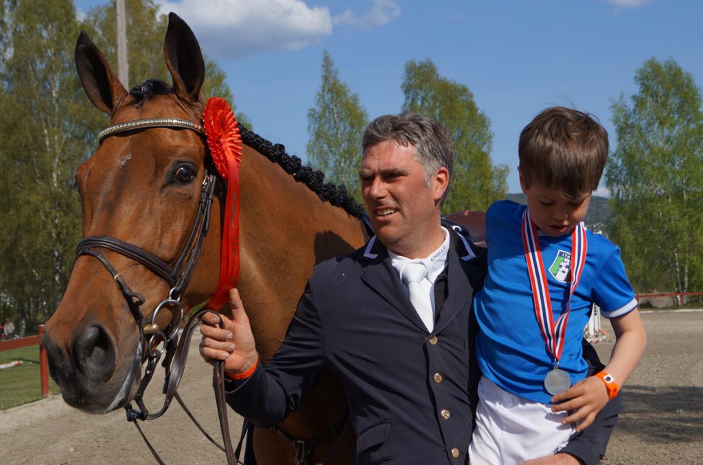 Bildetekst: Dag Ove Kingsrød lot sønnen William få smykke seg med sølvmedaljen han vant med Dimaro i Nordisk Baltisk Mesterskap i 2014. Foto: Trine Meiningen