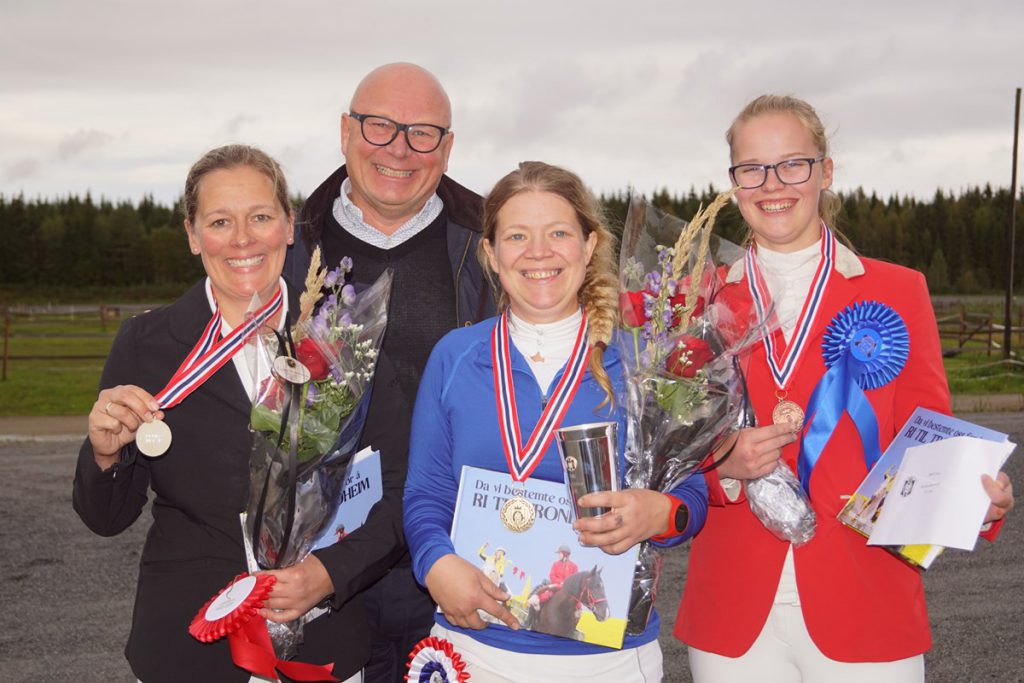 Bildetekst: Medaljevinnerne ble gratulert av president i NRYF, Tore Sannum. Mari Kolstadbråten Ekra ble Norgesmester, Ellen Suhr Ydstebø (t.v.) vant sølv, mens Maren Aanestad (t.h) vant bronse.