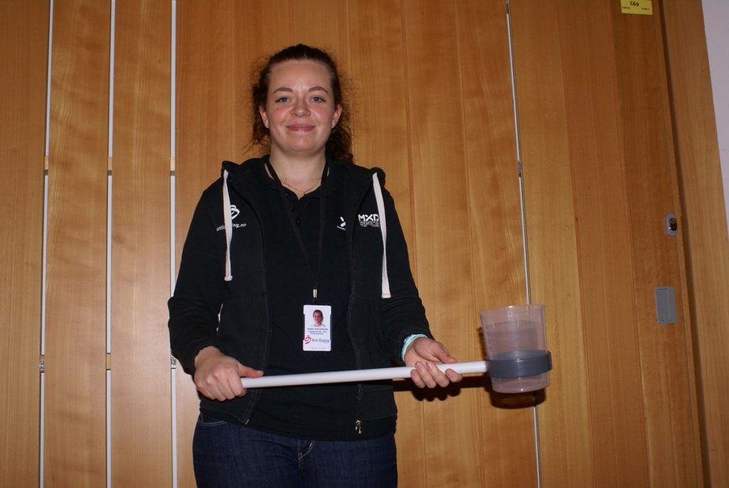 Bildetekst: Josefin Gustafsson fra Antidoping Norge viser frem urinprøveglasset som brukes under dopingkontroll av hest.