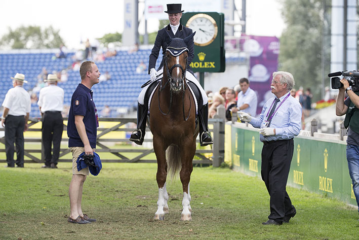 Med én ustartet deltager igjen på lagene, hadde Tyskland tatt en knapp ledelsen (226,071) foran Nederland (225,800) og Storbritannia (221,143). Dessverre for vertsnasjonen ble 79,743 prosent på ankerkvinne Kristina Bröring-Sprehe for lite mot nederlandske Edward Gal med 82,229 prosent og britiske Charlotte Dujardin med 83,029.