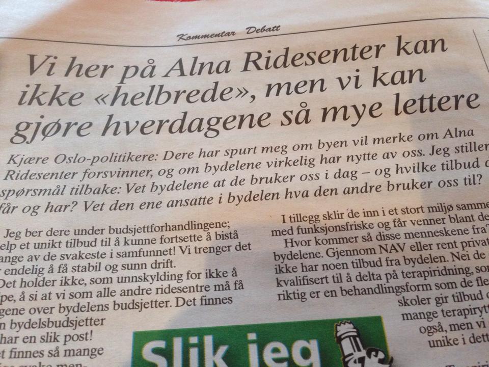 Forrige uke hadde Akers Avis Groruddalen et innlegg om den uvurderlige hjelpen et ridesenter gir de svakeste i samfunnet.
