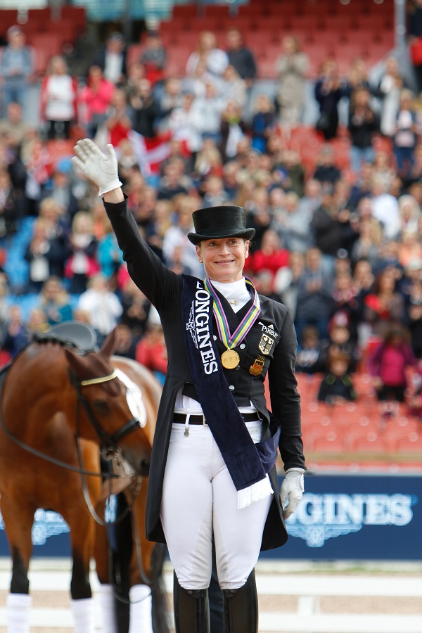 Et herlig program viste også danske Cathrine Dufour 25) med sin DV-vallak Atterupgaards Cassidy e. Caprimond/Donnerhall, et program vel verdt 79,761 % og bronse. Svenskene måtte se at deres nye komet innenfor railen, Therese Nilshagen med Dante Weltino e. Danone/Welt Hit II, akkurat ikke nådde pallen. Med 78,585 % ble det fjerdeplass, men sympatiske Therese var strålende fornøyd. – Det var fantastisk der ute i dag, og jeg er veldig stolt av hesten min!