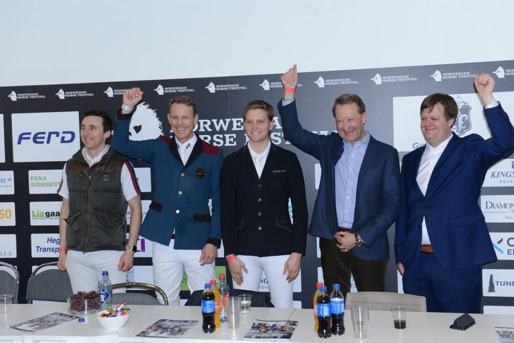 Bildetekst: Topp tre i søndagens CSI3* Grand Prix, sponsor og arrangør kan juble sammen over NHF. Fra venstre: Shane Carey, Peder Fredricson, Bjørn Rune Gjelsten og Eirik Berentsen. Foto: Anton Granhus