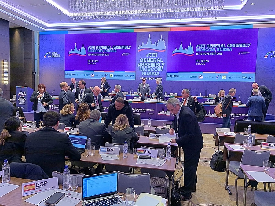 Generalforsamlingen ble lørdag åpnet av FEI president Ingmar de Vos. Generalforsamlingen for det internasjonale rytterforbundet går ikke upåaktet hen i den russiske hovedstaden – Russlands president Vladimir Putin postet en personlig hilsen på hjemmesiden til Kreml og den russiske regjeringen der han ønsket FEI-presidenten og alle delegatene ved generalforsamlingen velkommen til Russland for aller første gang.
