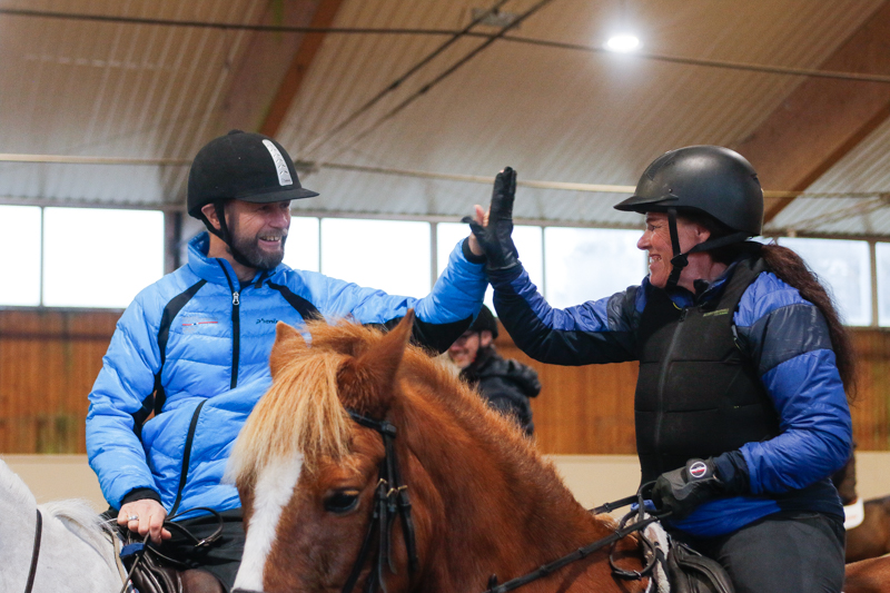 Bildetekst: Helseminister Bent Høie ga high five medAnita Johannessen etter rideøkten på Tune der utøverne i «Idretten skaper sjanser» ga et sterkt innblikk i hva rusmestringsprosjektet har ledet til.