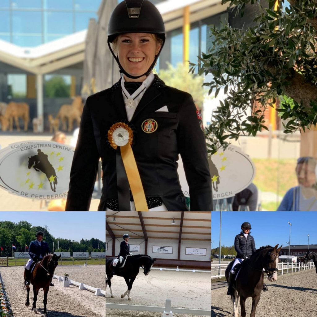 Bildetekst: Plassering og gode prosenter – det har vært en god start for de norske rytterne i CPEDI3*-stevnet i nederlandske Peelbergen i dag. Øverst: Hege Størseth, under t.v. Jens Lasse Dokkan, under i midten Stine Skillebek, under t.h. Tonje Lundqvist.
