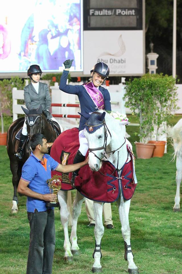 En lykkelig Anita Sande jublet denne helgen etter toppresultat ved FBMA Show Jumping Cup ved Abu Dhabi Golf & Equestrian Cup fredag kveld. Den Dubai-baserte rytteren gikk helt til topps i en 1,45 m klasse med sin hest Cash ved tostjerners-stevnet i Abu Dhabi. – Cash kommer inn på banen som en superstjerne og går ut igjen som en helt, det er som en drøm jeg ikke vil våkne fra! Jeg har jobbet og trent hester i så mange år, hester som så blir solgt – og nå er jeg en stolte eieren av en superstjerne. Jeg trenger bare konsentrere meg om å ri så godt som mulig og gjøre runden så perfekt som mulig – så vil Cash være feilfri. Og det beste er at Cash er ikke til salgs. I helgen gjorde Cash sin beste omhopping noensinne så langt – vi vant fordi han tok syv steg i stedet for 10, og det er hans spesialitet, det gjør at han vinner, sier Anita i sin blogg.
