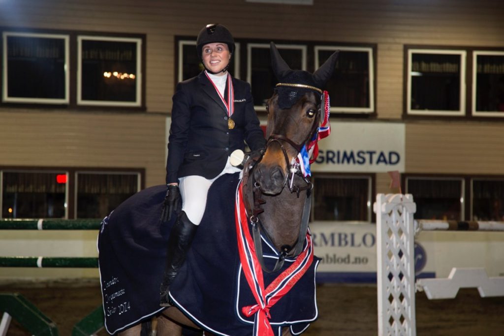 Med kun en liten tidsfeil i fredagens avdeling tok Line Karlsen Raaholt seieren i innendørs NM for seniorer. Drammensrytteren loset den ni år gamle vallaken Abrisco V gjennom to feilfrie runder i dag, og gullmedaljen var dermed et faktum.
