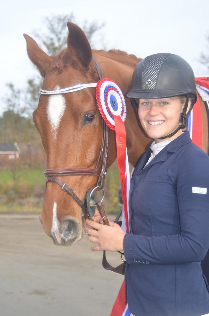 – Planen var å ri feilfritt, og å ri gode runder. Etter at jeg gikk over fra ponni til hest fordi jeg ble så altfor lang, – med min høyde stoppet det jo seg selv, demonstrerer Victoria – har vi trengt erfaringen, begge to. Vi deltok her i Arendal under hallmesterskapet for fireåringer i fjor, og det er utrolig morsomt å tenke tilbake på det nå og føle hvor enormt mye som har skjedd med hesten min på bare dette ene året. Han har utviklet seg ganske mye, og bærer seg mye bedre nå. Det er bare kjempemorsomt å ri hest!