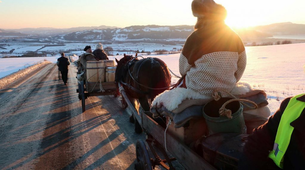 Første etappe gikk fra Trondheim til Klett, i dag er de på vei fra Kotsøy til Singsås. – De fire første dagene kjørte vi med gamle vogner, men på Kotsøy har vi møtt på sledeføre, så da har vi byttet til sleder, forteller Berit Morstad som er med i følget. – Vi begynte med å være 10 hester i følget, men det kommer flere til underveis. Totalt blir vi 18 hester i følget, av rasene dølahest, nordsvensk brukshest, fjordhest, kaldblodshest og ardenner – fire av disse er avlsgodkjente hingster.