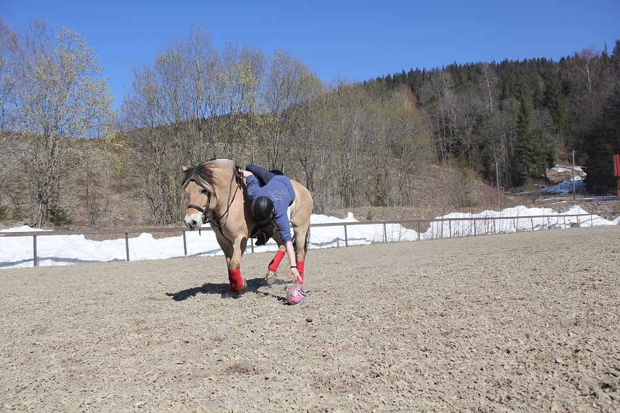 I nydelig vårvær var det fire ivrige ryttere som møtte opp. Noen av dem hadde prøvd Horseball tidligere, men trener Elida de Besche startet uansett med en grundig gjennomgang av teori, strategi og taktikk. Deretter fortsatte det med bakketrening for å komme inn i gangen av spillet og kasteteknikk på ballen.