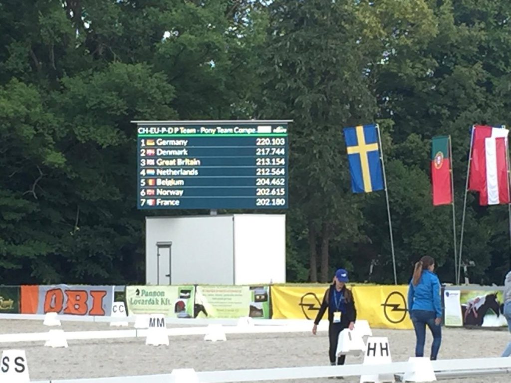 Bildetekst: En ganske herlig resultattavle – norsk sjetteplass i EM ponnidressur er et faktum. (Foto: Magnus Hillern)