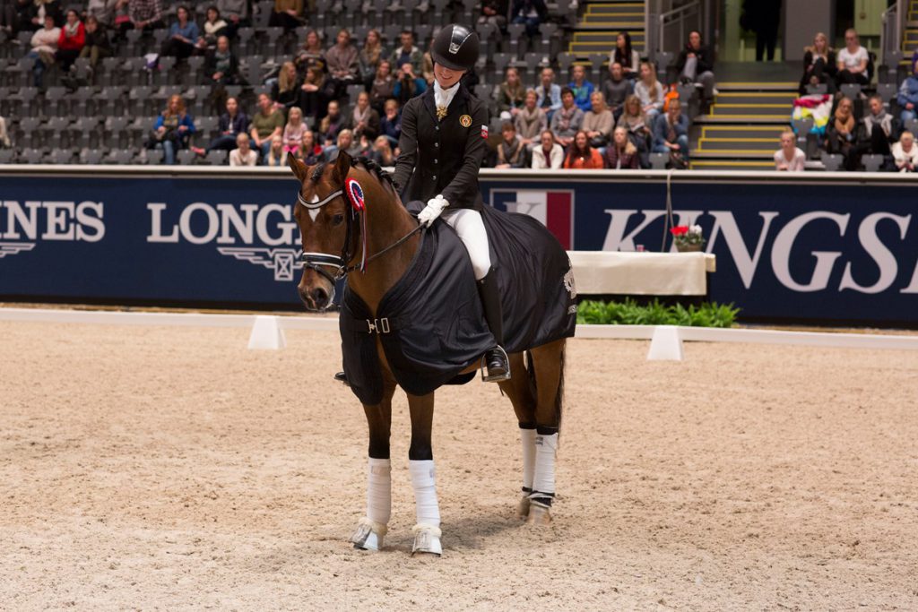 Bildetekst: Nora Ekrem og Davidoff mottar heder og ære etter den andre seieren under årets Kingsland Oslo Horse Show. (Foto: hesteguiden.com)