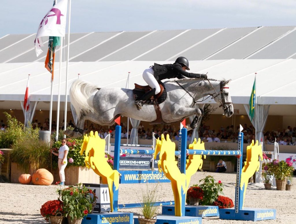 Bildetekst: At seks år gamle Ibiza har kvaliteter som vil bringe ham langt, levnes liten tvil. Her fra helgens UVM på Zangersheide med Victoria Gulliksen. Foto: Privat