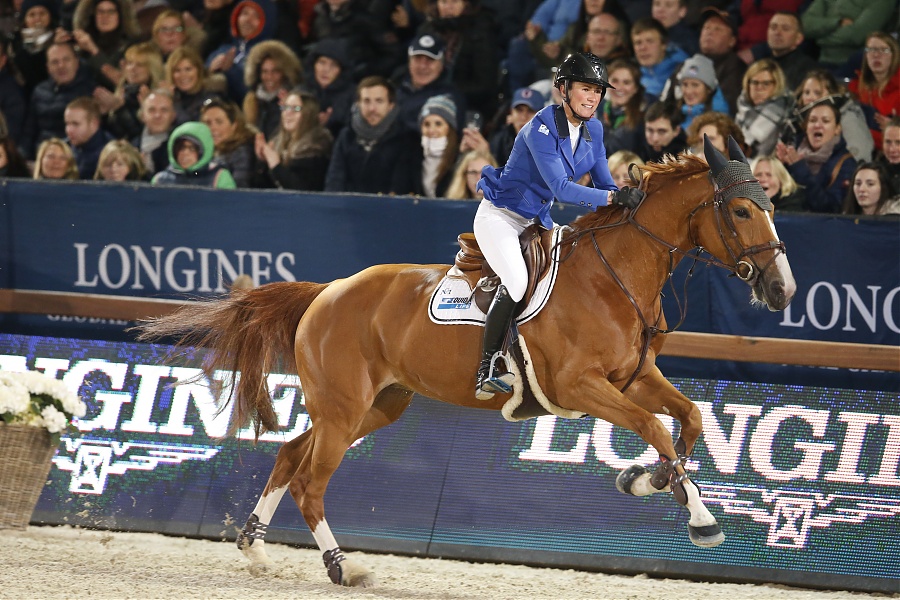 Bildetekst: En lykkelig vinner av gårsdagens LGCT Grand Prix 1,60 m i Antwerben, Penelope Leprevost, tøyler Flora de Mariposa inn til seier. Foto: LGCT/ Stefano Grasso