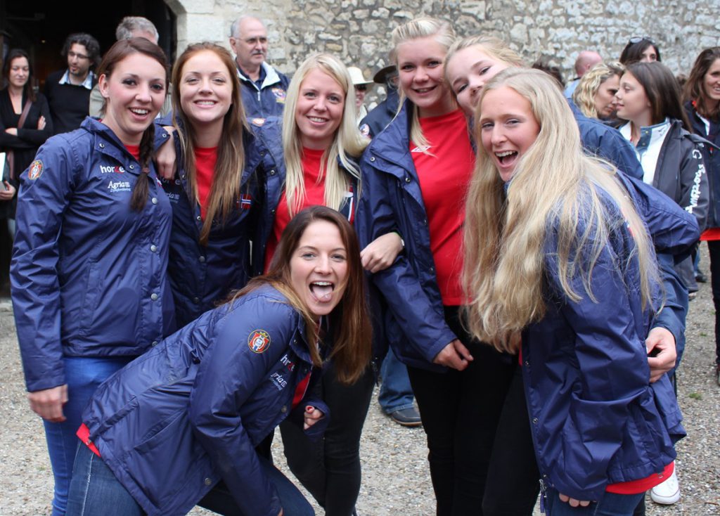 Bildetekst: Norges VM-lag i fri dressur. Fra venstre: Hari Sims (landslagstrener), Karoline Kjuus, Line Hilmersen, Karen S Houge, Sofie Houge, Heidi Bjørgo. Foran: Lillann Akselsen. Foto: Privat