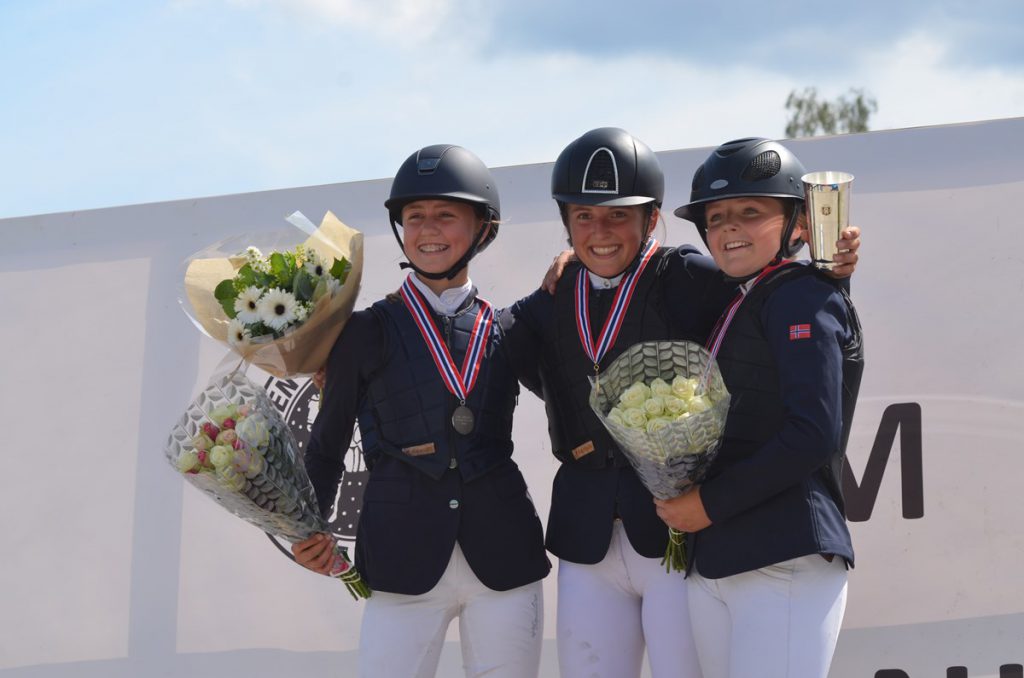 Tre lykkelige toerjenter stråler om kapp med solen på Linnesvollen denne lørdagen. -For det er ikke hver dag man blir NM-medaljør på ponni kategori 2!