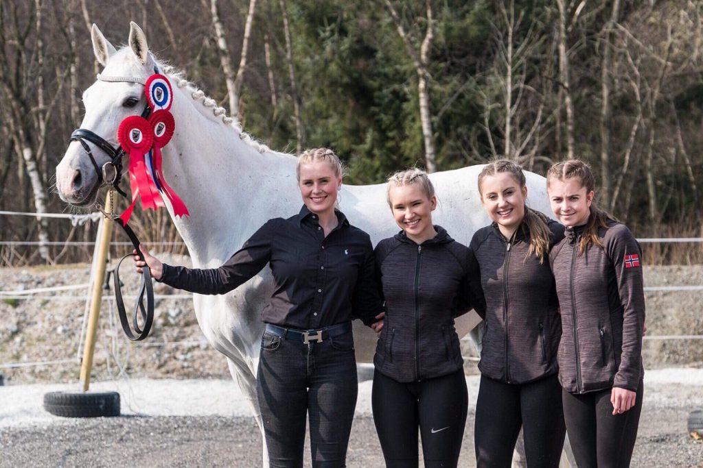 Bildetekst: Corano Capizet har vært ute fra sporten i et år med silosjuken. Nå viste hun på alle måter at hun er tilbake – hun ble beste hest under L-stevnet hos Rogaland Rideklubb. her sammen med Kaia Hegre, Miriam Haddeland Ree, Lea Runaninova og Maren Primstad. (Foto: Olav Hammer)