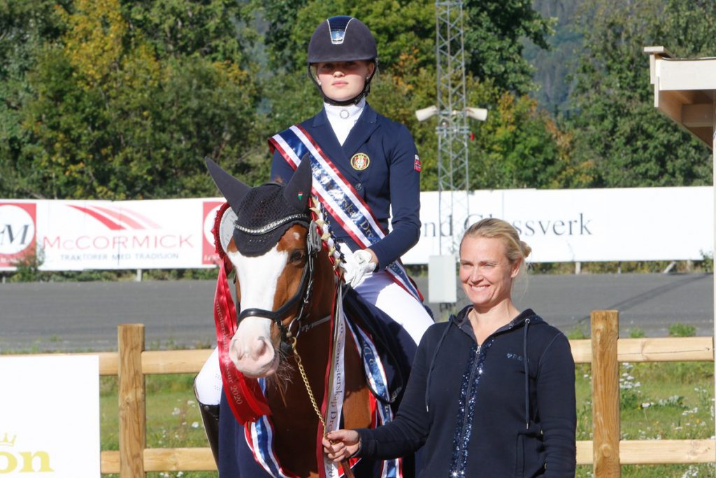 Louises elever presterte også særdeles godt – Marthe Sylte/JDJ’s Flash tok en flott femteplass blant kategori I ponniene, Maren Aarflot Strandheim/Svalegårdens Alanya sikret seg en velfortjent sølvmedalje i juniorklassen der også Marie Schilbred/Teglvangs Radomir ble en god nummer syv, Alise Kristind Nordvik/Samantha-Sølyst tok bronse i FH-klassen grad V mens Anita Hennie Johnsen/Lindegaard Lucky tok sølvet i FH grad 1 og 4. Mens Anita og Alise representerer Bruråk Hestesportsklubb, rir samtlige øvrige i kretsen rundt Louise for Oppdal Hestesportsklubb.