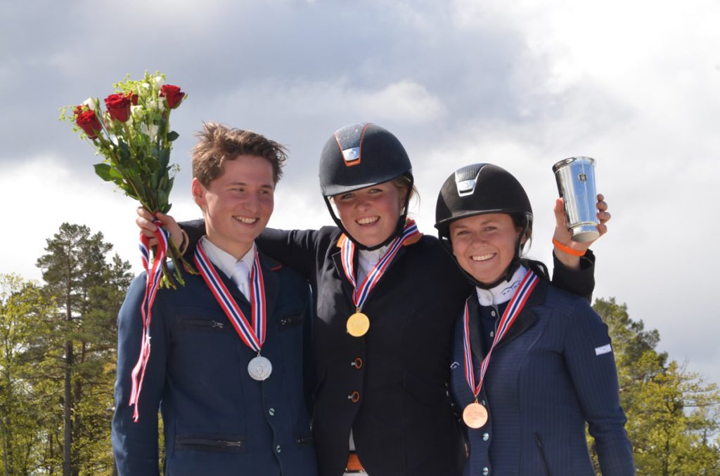 Bildetekst: Tre glade medaljører med all grunn til å smile etter topplasseringer i NM for unge ryttere: Pål Flam, Amalie Steen Hegre og Solveig Fotland Newermann Foto: Sille Kasin
