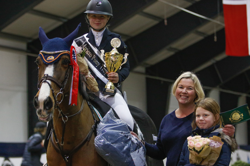 Bildetekst: Nora Fredriksen/Parc Cookie kunne som suverene vinnere av Mariero Pony Trophy motta premiene fra sponsor Mariero Equine ved Tonje Mariero Moe, sammen med medhjelper Marie Kulltorp Gulliksen.