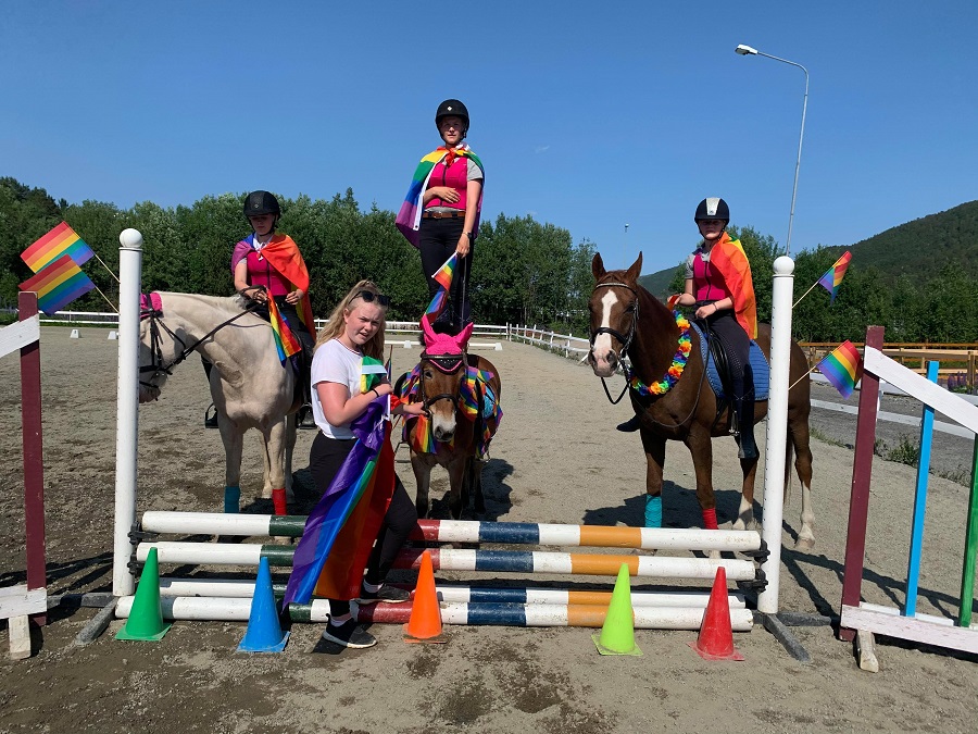-I fjor var vi også med i Pride-toget. Det kan vi bare anbefale – å ha med hest ved slike arrangement er en innertier. Vi gjorde litt ekstra ut av deltagelsen i dette toget, vi laget enhjørningshorn til hestene for å vise at vi støtter alle og ikke gjør forskjell på noen. Det er ikke alltid så lett å skille seg litt ut når man bor i en liten bygd, det føltes godt å bidra til at noen kanskje fikk det litt lettere, sier Edle Holmin, leder i klubben.