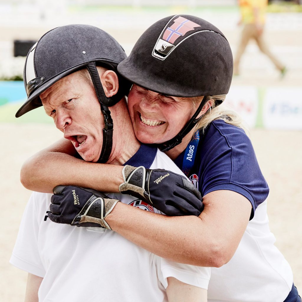 Bildetekst: Grad III-vinner i første del av lagkonkurransen, vår egen Ann Cathrin Lübbe, gir lagkollega Jens Lasse Dokkan en real klem etter innsatsen i grad 1a. Foto: FEI/ Liz Gregg