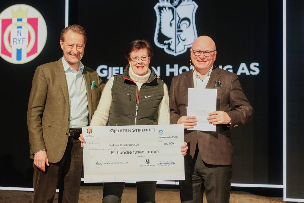 Bildetekst: Bruråk Hestesportsklubb var en av ti klubber som fikk tildelt Gjelsten-stipendet på 100 000 kroner under Norwegian Horse Festival i fjor. Fra venstre Bjørn Rune Gjelsten fra Gjelsten Holding AS, Anne Cathrine Menne og Tore Sannum, president i NRYF (Foto: Rebecca Ballestad-Mender)