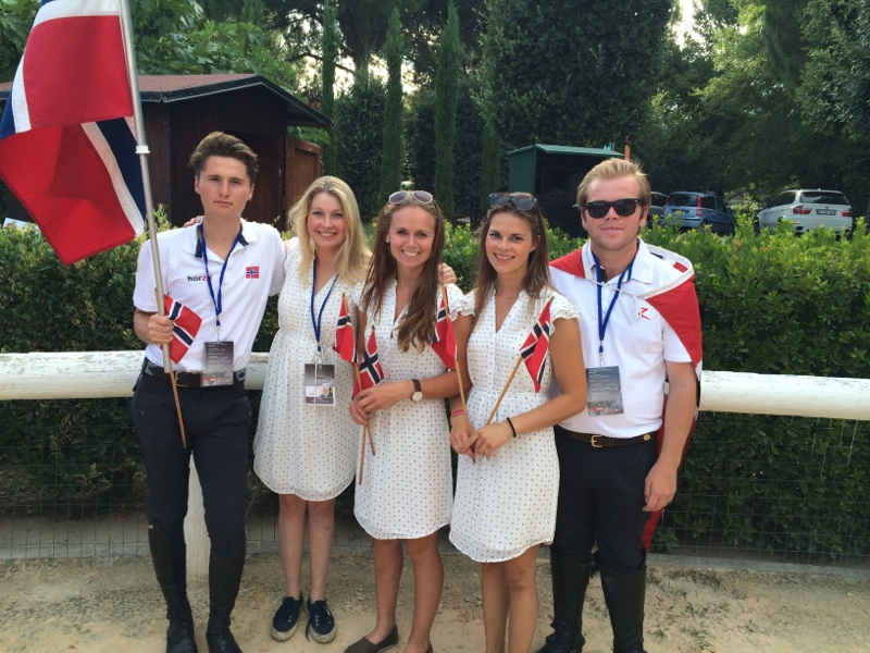 Bildetekst: Norges unge ryttere stod for en fantastisk laginnsats i dag. Fra venstre Pål Flam, Benedikte Serigstad Endresen, Solveig Fotland Newermann, Maren Smedhaug og Andreas Jensen. Foto: Mikael Kolind