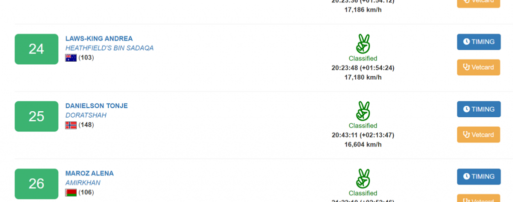 Etter en innledende ranking som nummer 25 red Tonje seg sterkt oppover på listen i løpet av dagens ritt. Sammen med sin 14 år gamle hoppe Doratshah avsluttet Tonje på en imponerende på 25. plass, med en gjennomssnittstid på 16,6 km/t.