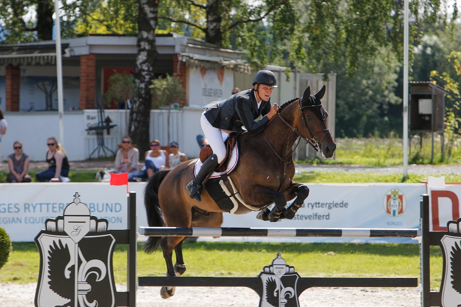 Både Johan og Geir var på startlisten til 1,50-1,55 m klassen – som også rommet første runde av Global Champions League. Johan red her Calido 76 og det startet riktig bra. I trekombinasjonen gikk det imidlertid helt annerledes enn tenkt. Det ble et brått stopp på b-hinderet, og Johan fikk nærkontakt både med bommer og underlag. Calido tok seg en tur på egen hånd, med hodelaget etter seg. Han ble imidlertid raskt fanget inn, og Johan, som var raskt på bena, kunne leie ham ut selv.