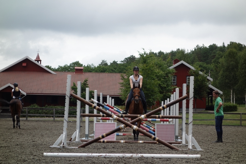 I dag har vi en lang stuss-serie på ti hinder. Da må hestene konsentrere seg og holde samme rytmen hele veien. Det er fordelen med en lang stuss – hesten får ikke muligheten til å skynde seg gjennom som de kan gjøre på en liten stuss med fire hinder. På ett eller annet tidspunkt må hestene bremse og se seg for. I tillegg er det en veldig tung øvelse for hestene, fordi de må bruke god tid på sprangene – og det er bra trening for musklene!