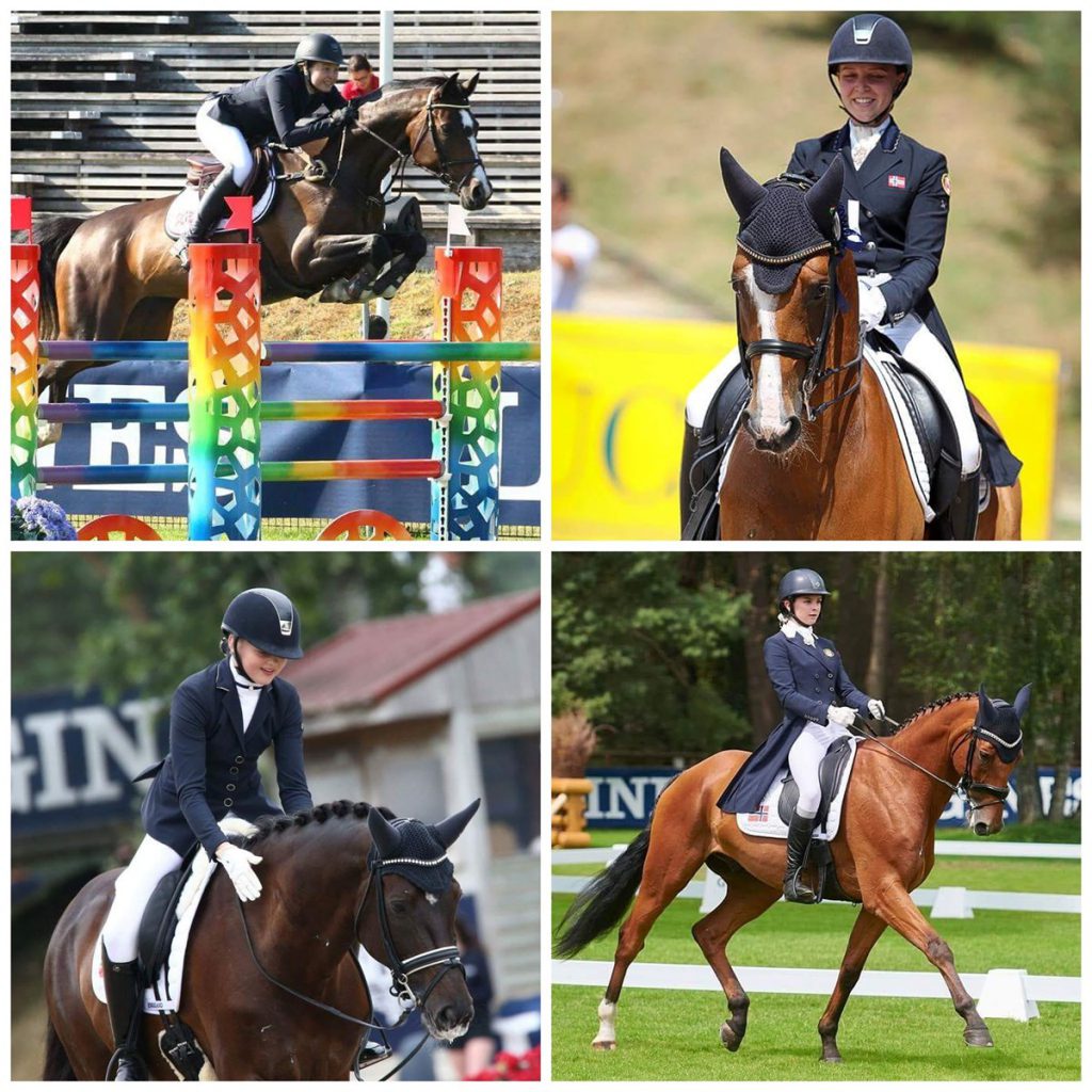 Bildetekst: Emelie Østbø, Mathilde Klaesson, Emma Løkken og Emilie Laumann var blant de norske utøverne som presterte best ved årets EM for children, juniorer og unge ryttere på Fontainebleau. Sammen representerer disse fire alle tre grener i mesterskapet. Foto: PSV photo (Emelie, sprang og Emma, dressur), Eurodressage (Mathilde, dressur) og Ingo Waechter Images (Emilie, feltritt)