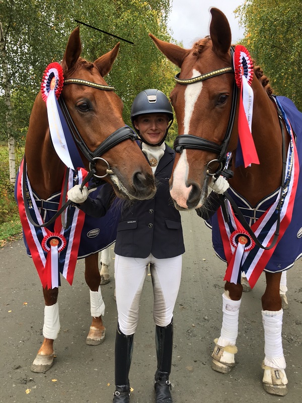 Fredrikke klarte kunststykket å oppnå helt lik poensum også i 6-års klassen, da med den tyskfødte vallaken Dice e. Desperados/Lanthan. Det holdt til delt seier i klassen – på samme prosentresultat havnet også vinneren av Norsk Breeders Trophy, UVM-ekvipasjen Silje Tornvik (FLORA)/Maro’s Fabergée e. Fassbinder/Blue Hors Romanov. Eier på denne hoppen er rytter selv, mens oppdretter er Linn Næss Evensen.