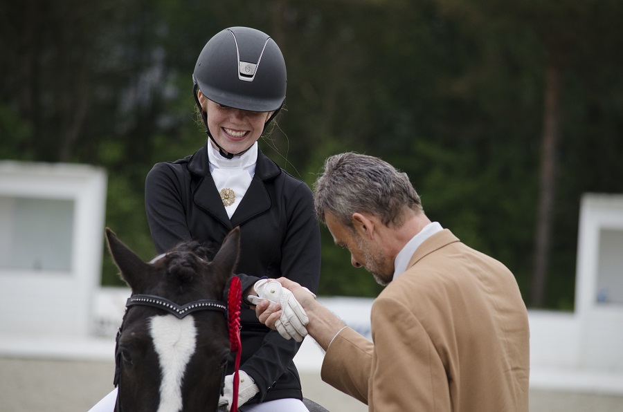 Bildetekst: Tre dager med dressur var det i helgen hos Sandnes og Jæren – klubbens Mali Vigre Vølstad gledet seg over gode resultater og hyggelige kommentarer fra dommerne, deriblant Peter Fischer.