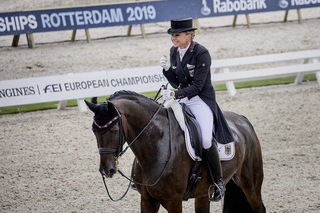 Dorothee Schneider/Showtime e. Sandro Hit/Rotspon og Jessica von Bredow-Werndl/TSF Dalera BB e. Easy Game/Handryk noterte seg henholdsvis 80,233 og 76,984 % i dag. Dermed ligger Tyskland i tet når 34 ekvipasjer totalt har ridd, foran Storbritannia, Sverige, Nederland, Danmark og Portugal. For det engelske laget har Charlotte Fry/Dark Legend e. Zucchero/Tango og Gareth Hughes/Classic Briolinca e. Trento B/Royal Dance ridd i dag, i morgen skal Carl Hester/Hawtins Delicato e. Diamond Hit/Regazzoni og Charlotte Dujardin/Mount St John Freestyle e. Fidermark/Donnerhall i ilden. For Tyskland er det Sönke Rothenberger/Cosmo e. van Gogh/Fruhling og Isabell Werth/Bella Rose e. Belissimo/Cacir Aa som gjenstår.