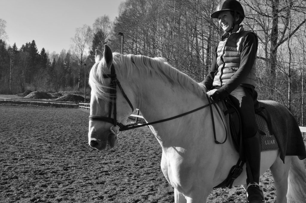 Etter 30 år uten å ha sittet på en hesterygg dro Anne og noen venninner på rideferie i Portugal. Der ble interessen vekket til live igjen, og helt på sparket tok hun med seg en hest hjem til Norge. Flere år og hester senere er hun i stallen hos den 23 år gamle Lusitanohingsten Luar så godt som hver dag.