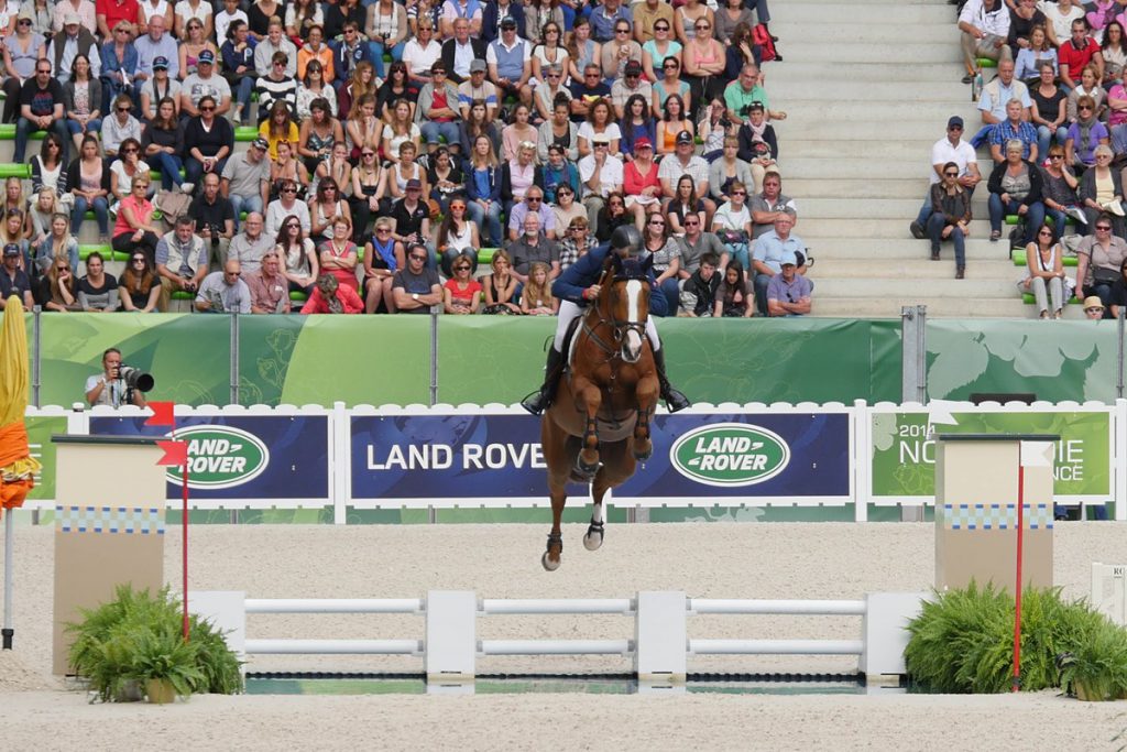 Gårsdagens vannskrekk var historie og hesten hoppet enkelt over vanngraven, men fikk et riv på påfølgende rekk.